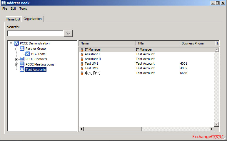 以下是Outlook中看到的结构化地址簿,可以看到,右侧列表中的用户是按照字母排序的,而排在第一位的是经理。也就是说,我们可以定制HAB的排序规则。