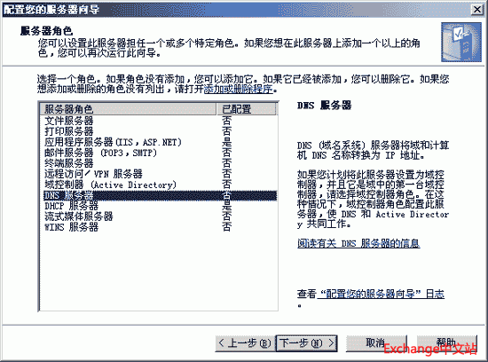 第1步,依次单击“开始/管理工具/配置您的服务器向导”打开的向导页中依次单击“下一步”按钮。配置向导自动检测所有网络连接的设置情况,若没有发现问题则进入“服务器角色”向导页。