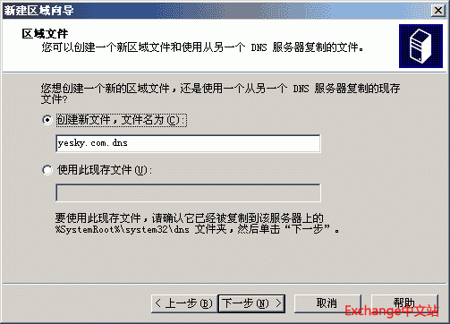 第4步,在打开的“区域文件”向导页中已经根据区域名称默认填入了一个文件名。该文件是一个ASCII文本文件,里面保存着该区域的信息,默认情况下保存在“windowssystem32dns”文件夹中。保持默认值不变,单击“下一步”按钮(如图6)。