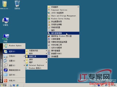 在Windows Server 2008(或Windows Server 2008 R2)中,单击“开始”-“程序”-“管理工具”-“服务器管理”,或在“运行”中输入命令:servermanager.msc命令打“服务器管理”程序。