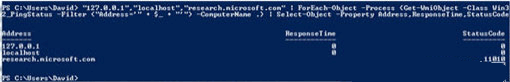 下面的例子中,使用Win32_PingStatus输出结果,并使用select-Object来对结果进行解析,使得最后输出结果仅显示输出的响应时间和状态代码。