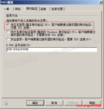 | 在使用 Foxmail 与 Exchange 服务器配置的时候会遇到一直提示密码错误的问题,表现就是在收取邮件的时候一直提示“接收密码错误”。其中有一种情况就是与 Exchange服务器的 的选项配置。 即在 Exchange 服务器的 “服务器设置”-“客户端访问”-“POP3验证方式“,将此处的选择改为 ”纯文本登录(基本身份验证)“,然后重启 Exchange 服务器 或者 重启 Exchange 服务器的 POP3 服务即可解决此问题。