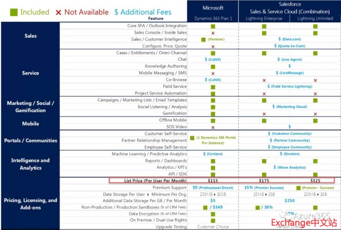 计价方面D365的总持有成本(TCO)更低,并且价格相当透明,并且可根据单个用户的角色申请不同的许可证(License),同时CRM的Portal、销售智能、BI、社群、销售机会积分功能都是免费的增值服务,最后API查询没有限制;而Salesforce这部分首先TCO和订阅价格更高,许可证也没有D365那样的粒度,作为增值的沙盒、数据存储和数据加密都是收费的功能,API调用,邮件及查询都有数量限制。两者的基础报价和功能可参见下表。