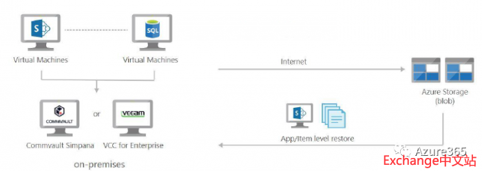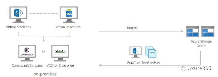 当然Azure的备份也支持第三方的备份程序,通常这类第三方程序可以对接Azure的Blob存储,这样就不需要额外购置Azure Backup服务,只需要使用Blob存储。恢复时同样将对象存储数据按照应用/数据项的粒度恢复到本地的第三方应用程序中。