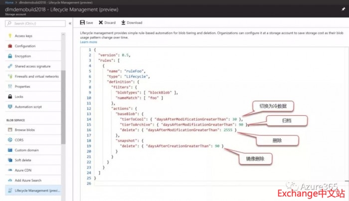 Azure Blob的配置界面提供了图形结合脚本编程的干预方式,例如在生命周期管理界面,通过简单的YAML文件可以自动定义入站数据的生命周期管理。包括什么时候切换为“冷数据”状态、什么时候归档、什么时候删除、什么时候删除镜像等等。
