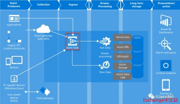 在对接如此多的数据源后,面对这些原始事件,普通的流管道是有超时时间的,同时在不确定OLAP和OLTP需求之前,也无法轻易地直接将其转存到任何一个持久化场所。这里就需要一个事件中心(Event Hub)来充当大数据的入口。