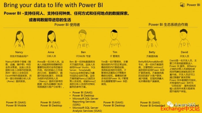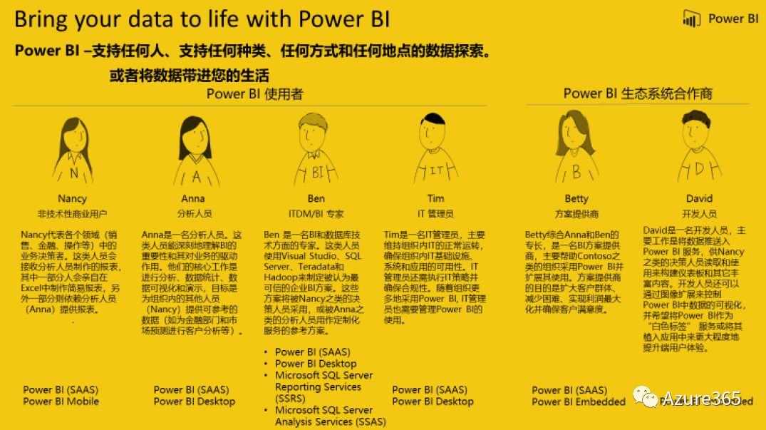 说到微软的智能分析,大家一定会想到PowerBI。是的,作为商业分析工具,PowerBI可连接数百个数据源、简化数据准备并提供即席分析,生成美观的报表并进行发布,供组织在Web和移动设备上使用。并且每个用户都可以创建个性化的仪表盘,获取针对其业务的全方位独特见解。在企业内实现扩展并内置管理与安全性,与O365无缝对接。