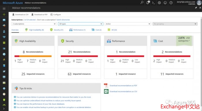 核心监控模块中的Azure顾问服务可帮助用户遵循最佳做法来优化Azure部署,分析资源配置和遥测使用情况并推荐解决方案,有助于提高Azure资源的经济效益、性能、高可用性和安全性。并且这项功能已在Azure China开始预览。