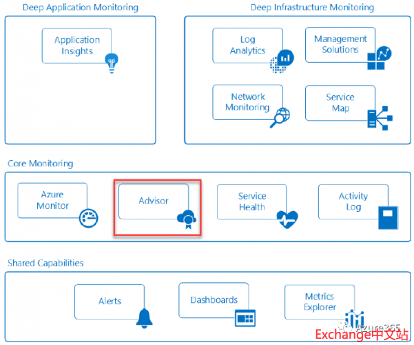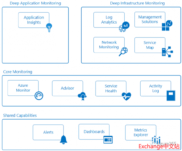 我们来看下Azure监控的全景图,包括了核心监控、深度应用监控、深度基础架构监控以及与其他Azure服务共享的组件。