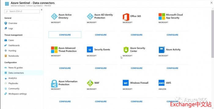 从上图可以看到Azure Sentinel从事件收集、检测、调查、响应提供了一站式的最佳实践解决方案,并且借助ExpressRoute可提供理论上无限的云速度和规模,通过内置AI功能提供更快的威胁防护功能,借助预定义的连接器可以连接到各种Azure或第三方资源。