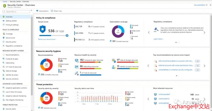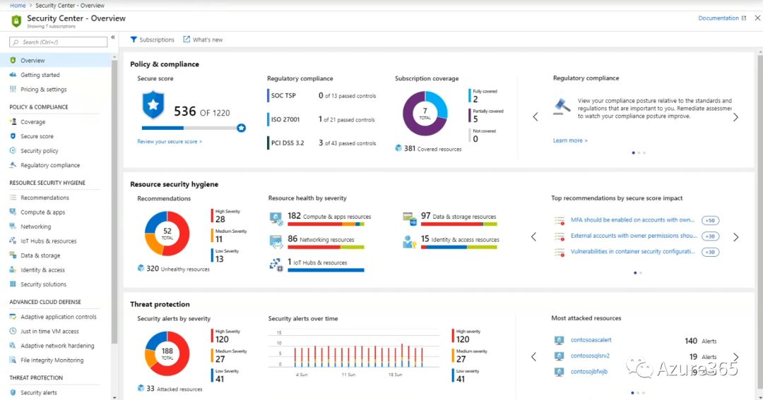 Azure的安全中心从源头评估各系统(包括本地以及第三方系统)的漏洞等级以及安全策略落实情况,并对攻击对象数据库和应用做有效安全加固。