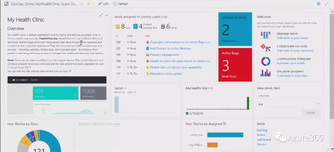 其次为强化IDE的协同功能,官方发布了VS的协同版“Visual Studio Team Services(VSTS)”,除了与本地版的VS集成,VSTS还可以与Eclipse,Android Studio等前端工具集成,实现项目在云端的团队开发(5项目成员以下免费)。同时VSTS支持本地或云端的Team Foundation或分布式工具Git进行版本管理。之前小编在Devops单元介绍过这款工具(【全网首播:Azure大全】9. Devops),作为开发经理或项目负责人,登录项目页就能清楚地看到工作的完成情况,包括未完成的工作包、尚未解决的Bug,作为敏捷项目还需要的冲刺周期等等。