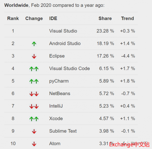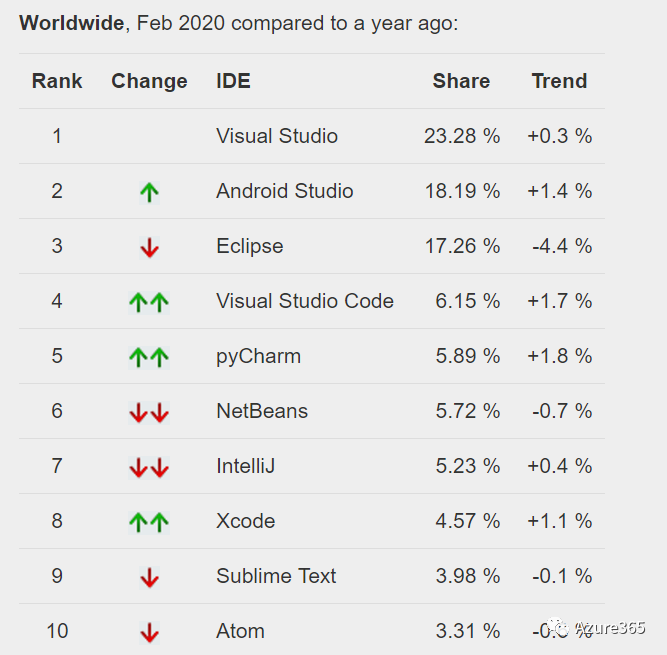 为了方便开发人员适应云环境,替Azure开发定制应用,构建了一套很友善的开发环境。首先他将地表最强IDE –– Visual Studio移植到了云上:Visual Studio for Azure从VS中获取了所有功能,使开发人员在Azure上可轻松生成、管理和部署云规模应用程序。以下图表是最新的IDE市场份额排名,VS几乎从它诞生之初就一直雄霸这份榜单。