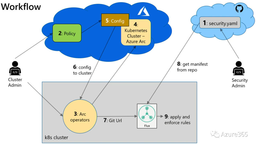 在GitOps的概念里,Github的安全管理员将安全配置Yaml文件上传到云端,Pods集群管理员定义策略,指定某个应用受某一Git Repo的安全控制,然后K8S集群通过Arc操作器将配置写到位于云端的Azure Arc中,本地的K8S集群就去找Git Repo的Url,最后匹配到这一集群所应配置的安全基线。