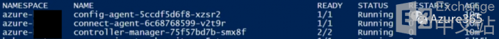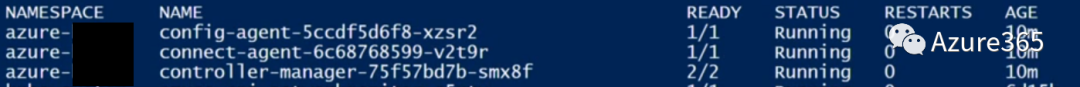 在Azure Arc for K8S的环境里创建集群会自动生成“azure–<资源组名>”的命名空间,这个命名空间包含了Azure Arc的配置代理,连接代理和控制管理器,以将对外接口全部集成到Azure Portal上。