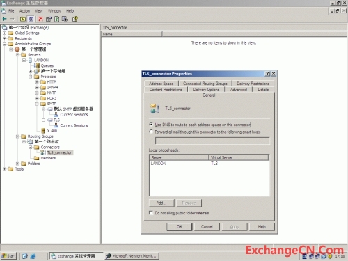 在smtp虚拟服务器属性里面,communication按钮下,还有一个”require secure chanel”可以选择,但如果选择了这个选项,所有通过这个虚拟服务器的通讯都需要使用TLS连接,即便是在和一个服务器上的另外一个smtp虚拟服务器通讯。