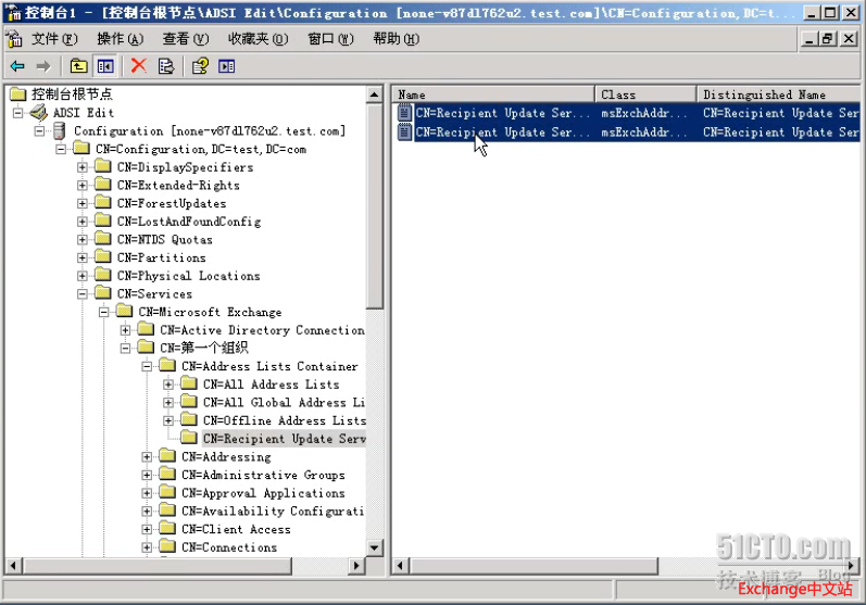 7、 删除Exchange 2003的收件人更新服务,exchange 2010不需要收件人更新服务。登录域控制器,打开ADSIEDIT.MSC,右击选择“连接到”-选择“配置分区”,展开“配置分区”如下图:将收件人更新服务下的两个选项内容删除,为图示所选内容。
