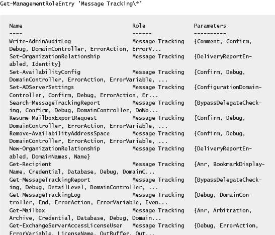 那角色是什么,角色是指令与参数的合集,这个在图形界面下看不到,只有通过命令行查看,比如我们想看看Message Tracking角色能做点什么,输入Get-managementRoleEntry ‘Message Tracking\*’