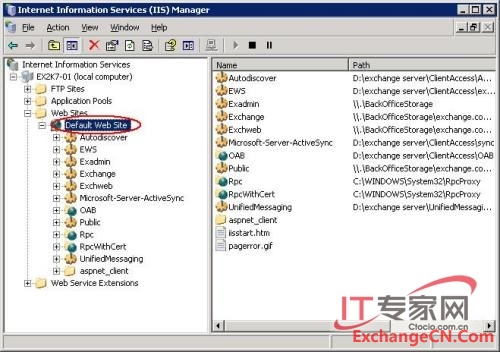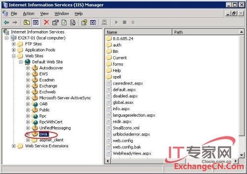 6、 命令执行完成后,我们可以在EMC中看到owa 虚拟目录,如图4所示,在IIS管理工具中,也能够看到owa虚拟目录,如图5所示。