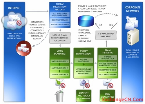 Microsoft Exchange 主机过滤是一种受全面管理的电子邮件服务,协助您在病毒和垃圾邮件到达网络之前将其阻止。Exchange 主机过滤提供具有高捕获率和无错误特征的、可靠的垃圾邮件过滤功能。此外,该服务还协助提供全天候的病毒探测和阻隔,并协助您对流入和流出邮件执行企业电子邮件策略的灵活的过滤选项。