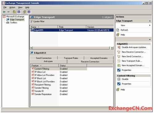 Exchange 边界传输服务器角色在二方面都提供最佳的表现。首先,它以电子邮件网关的形式提供增强的安全保护。这种网关被部署在网络的边缘。此外,它还向您提供一致的管理,即您通过使用其他 Exchange 服务器角色已已熟悉的 Exchange 管理控制台和 Exchange Management Shell。