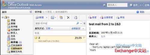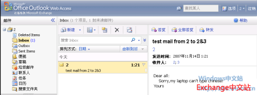 15、最后,还需要进行最近的测试,查看邮件是否被还原回来,通过OWA打开2个用户的邮箱察看邮件是否正确还原。