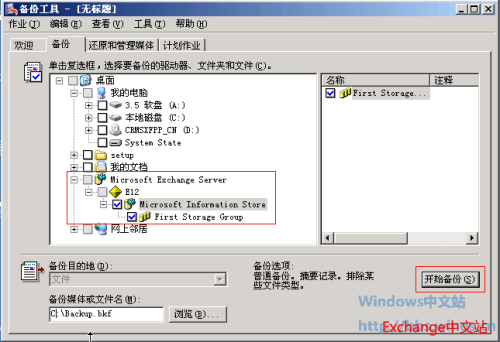 3、选择要备份的存储组和备份路径,然后在右下解点击“开始备份”。