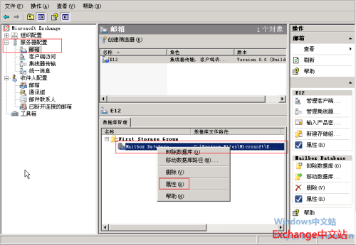 11、在完成数据库的还原后还需要将库据库装入,在Exchange管理控制台中展开“服务器配置” – “邮箱” ,在“数据库管理中”右键选择相应的数据库,然后选择“装入数据库”。