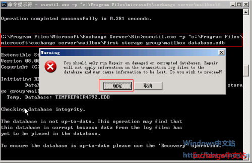 13、使用Eseutil工具来检查数据库的状态,发现为Dirty Shutdown状态。因此需要对数据库进行修复。Eseutil是一套可以对数据库进行碎片整理的工具,早在Exchange 5.5中就已经存在此套软件,请参考:Eseutil下载以及Eseutil使用说明。