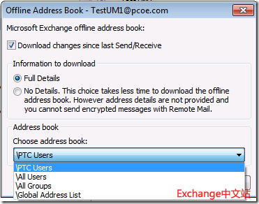 需要注意一点,脱机通讯录仅供Outlook客户端使用Exchange方式连接(MAPI/Outlook Anywhere),并且启用了缓存模式(Cache Mode)的情况下使用,其它任何类型的客户端都是不会用到脱机通讯录功能的。