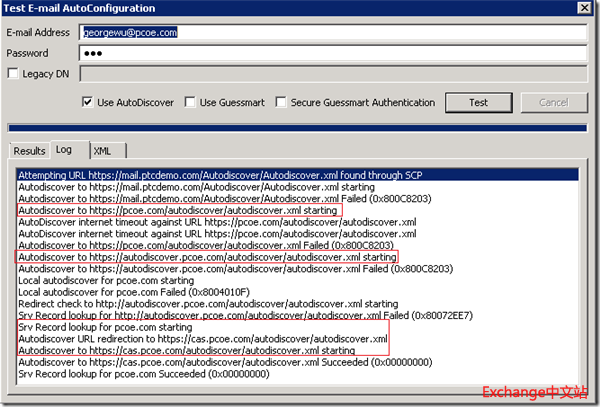 以下截图是从一台加入PTCDemo.com的客户端,通过AutoDiscover去连接位于PCOE.com的Exchange服务器, 也就是前面第2段视频的场景下,客户端所发起的连接尝试: