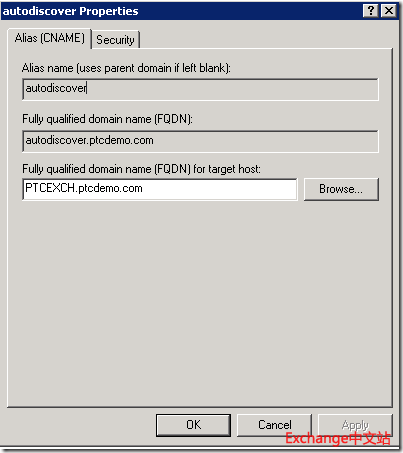 AutoDiscover主机记录可以利用别名(CNAME)来代替,例如在Windows的DNS中,可以注册一个CNAME记录,指向实际的Exchange主机。