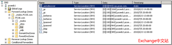 3、注册Exchange客户端访问服务器的主机记录,并创建一个名称为_autodiscover的SRV服务记录,指向该A记录