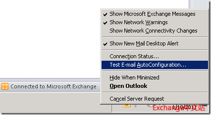在Outlook运行后,在Windows的系统托盘区,会出现一个Outlook图标,按住Ctrl键并用鼠标点击这个图标,在弹出窗口中,可以看到Test E-mail AutoConfiguration菜单项,点击后就可以进行自动配置的检查。
