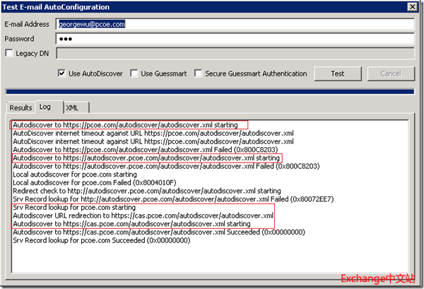 输入电子邮件地址和密码后,点击Test后,Outlook就开始检索自动发现服务。可以从Log中查看Outlook检索服务时的顺序: