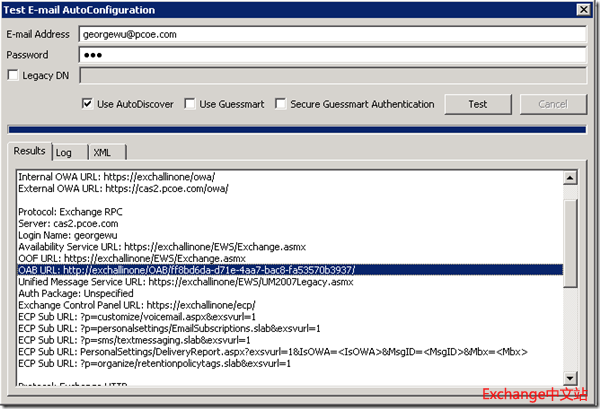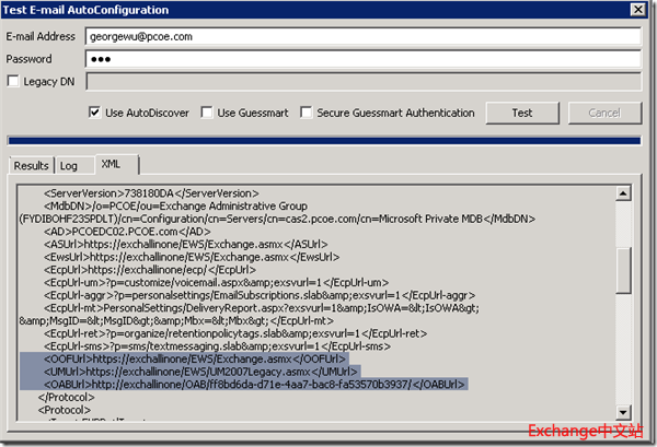Results中看到的,是根据autodiscover.xml文件的数据解读出的配置信息。