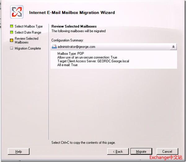 8、从控制台中间的窗口中,选中所有用户,点击右边的Migrate Selected Mailbox,在导入向导中,选择如下图所示,然后点击下一步: