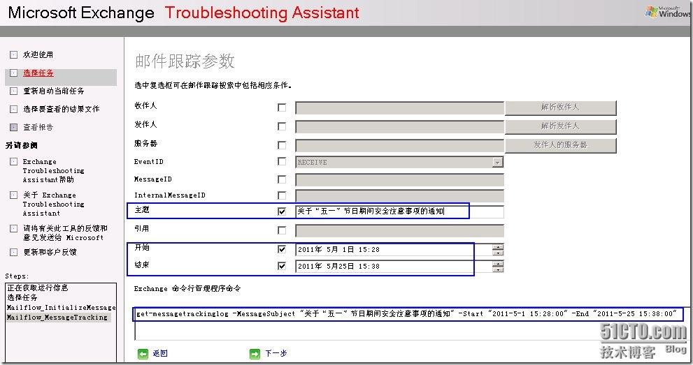 另外,注意如果指定的条件中包含“”的符号,那么跟踪将失败,因为我们虽然是图形界面执行的操作,但是后台还是通过exchange power shell来执行的该命令,如图我们指定的主题中包含“”,那么会返回报错