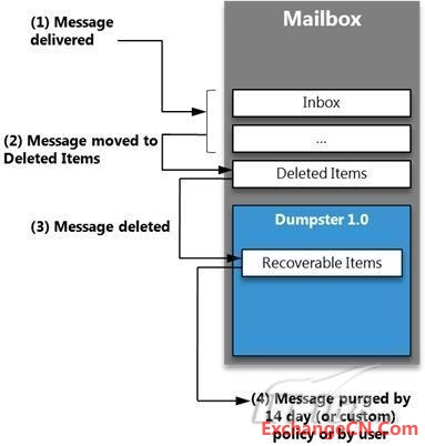 最终用户的单项恢复功能通过存储垃圾箱实现。管理员以每个数据库或每个邮箱为单位配置垃圾箱。默认情况下,Exchange 2003中删除项目保留7天,Exchange 2007的默认值是14天。