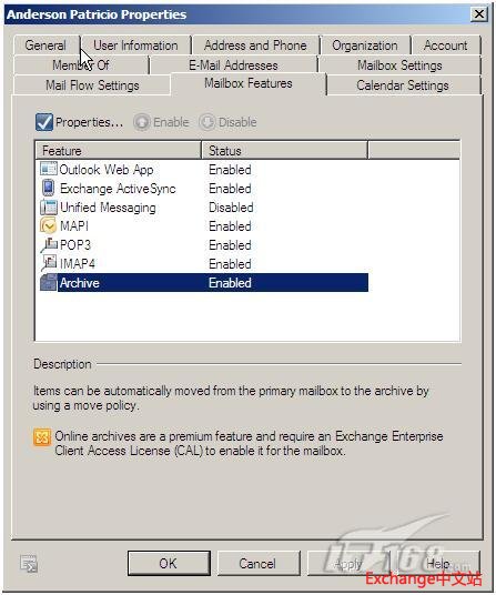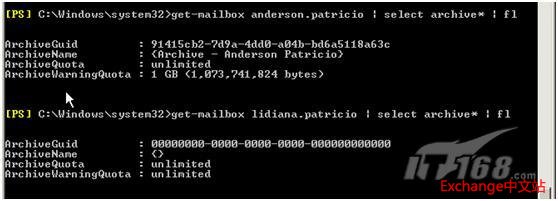 同样也可以利用Exchange Management Shell来查看一个归档邮箱的属性。在cmdlet中输入命令:Get-Mailbox | Select archive* | fl。这样就能够看到俩个用户信息上的区别了。
