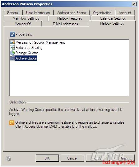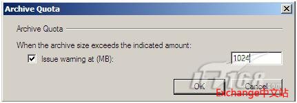 在弹出的对话框中,可以对阙值进行重新设定。也可以不通过图形界面进行设置,其修改命令代码:Set-Mailbox -ArchiveQuota 2GB