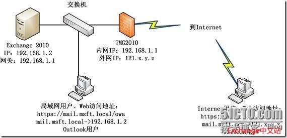 在图1中,内网用户可以使用https://mail.msft.local访问,其中msft.local是内网Active Directory域名,mail.msft.local被解析到Exchange 2010服务器的地址192.168.1.2,内网用户还可以通过Outlook访问。