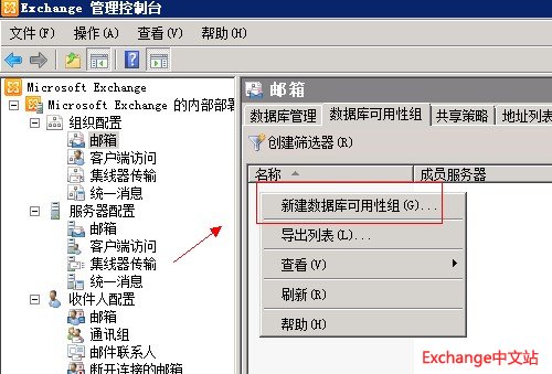 打开Exchange管理控制台,展开“组织配置”节点并选择“邮箱”,在“邮箱”中选择“数据库可用性组”标签,右键点击空白处选择“新建数据库可用性组”。
