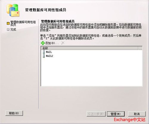 ![]() 将两台邮箱服务器添加到DAG中,然后选择“管理”直至完成数据库可用性组成员的添加。
