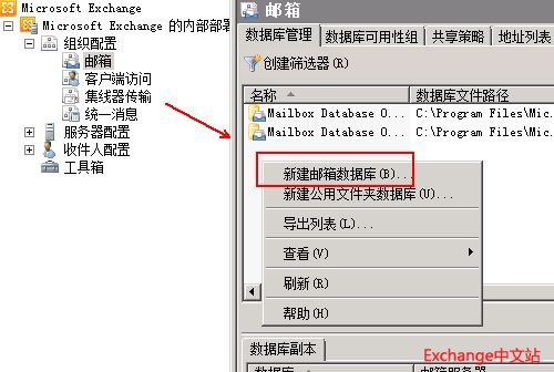 在建立完数据库可用性组后,切换到“数据库管理”标签,右键点击空白处然后选择“新建邮箱数据库”。