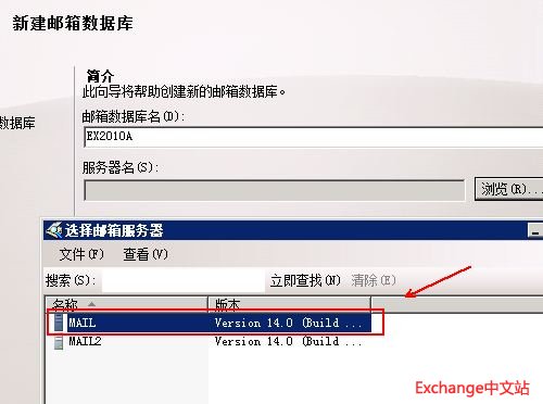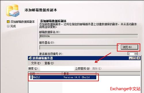 在数据库管理页面选中创建在第一台邮箱服务器MAIL中创建的邮箱数据库EX2010A,然后在下面板中“数据库副本”中选择“添加数据库副本”,在“添加数据库副本”向导界面中,点击“服务器名”右侧的“浏览”,在“选择邮箱服务器”界面选择第二台邮箱服务器MAIL2。