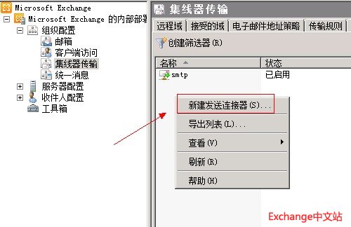 打开Exchange管理控制台 – “组织配置” – “集线器传输” – “发送连接器”,在空白处点击右键并选择“新建发送连接器”。