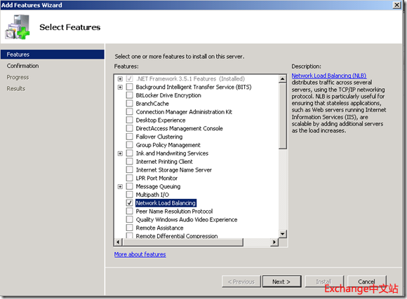 1、安装网络负载均衡组件。这个组件可以通过Windows Server 2008/R2的服务器管理器,在添加功能的模块中进行。所有计划加入NLB的服务器上,都需要进行安装。