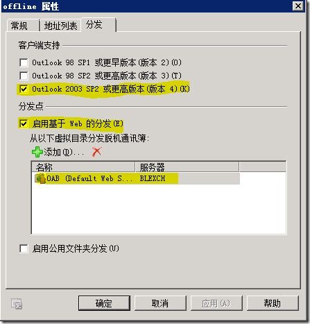 步骤二:检查脱机通讯薄的分发和地址列表属性是否正确,如图,我的分发是使用Version4,并且是基于WEB方式的分发,我的地址列表是默认的全局地址列表