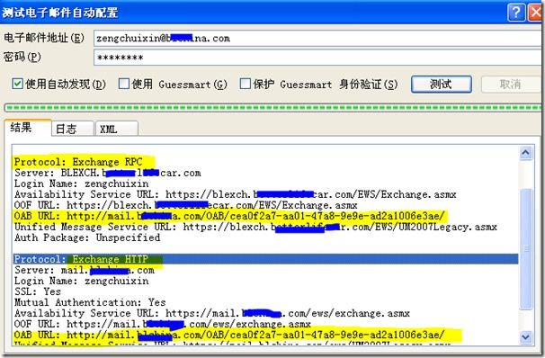 首先在outlook客户端做自动发现的测试,能够发现正确的OAB URL如图